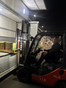 ▲ トラック内部の梱包ステーション。スタッフが丁寧にダンボール箱にラベルを貼り付け、出荷準備を進めています。